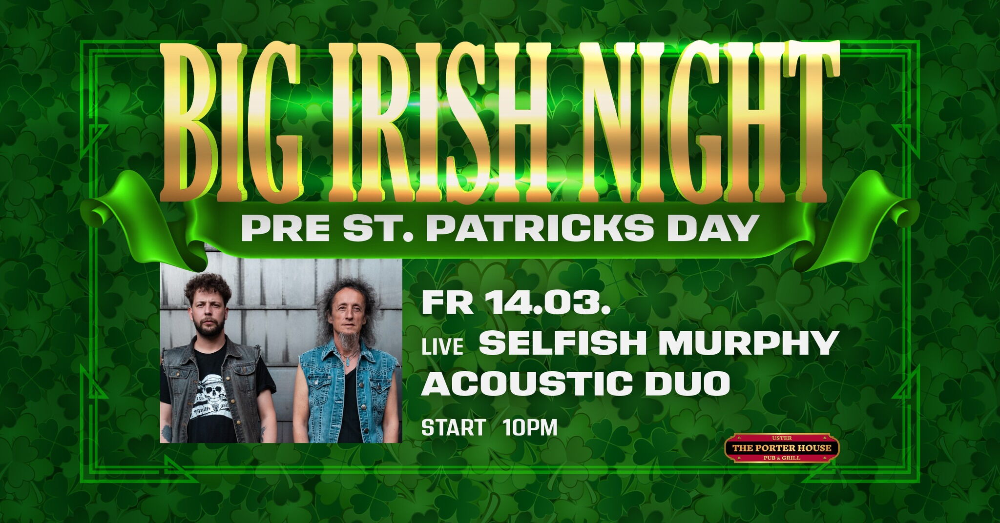 Wir zelebrieren den St. Patrick's Day mit einer Irish Night am Freitag, 14. März. Live on stage - Selfish Murphy Acoustic Duo.